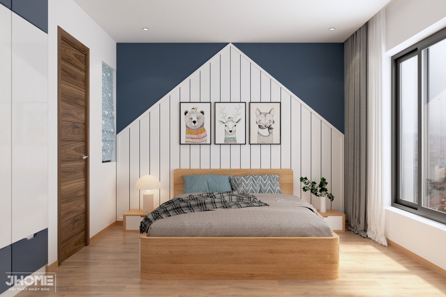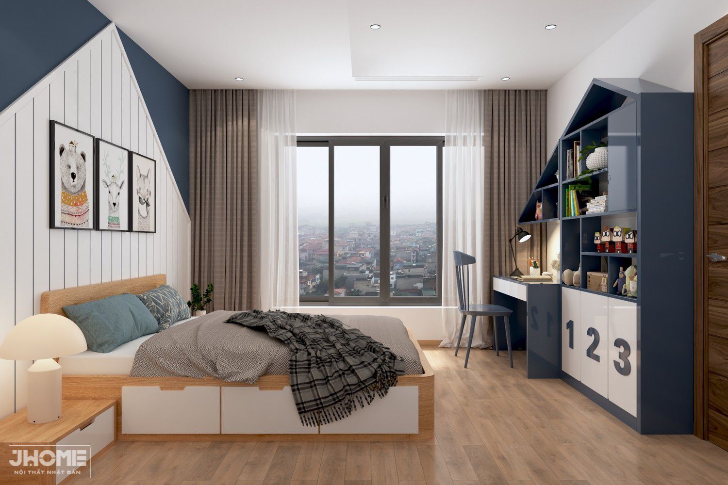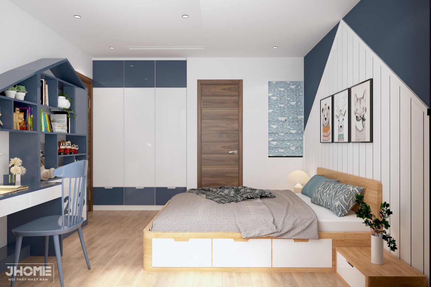 Phòng ngủ con sử dụng gam màu xanh và trắng chủ đạo