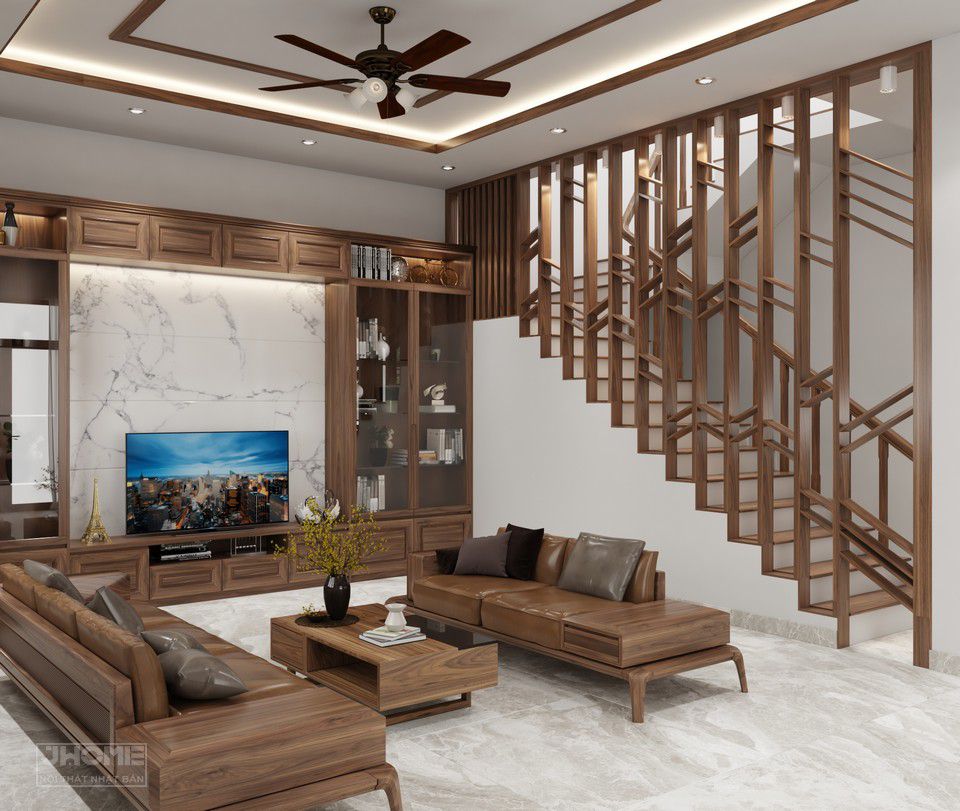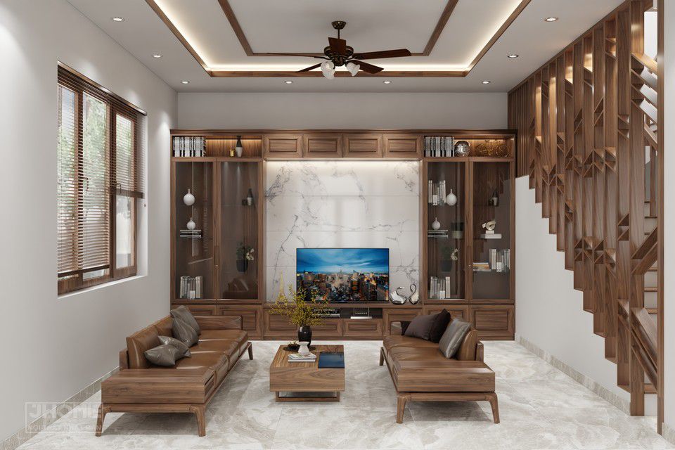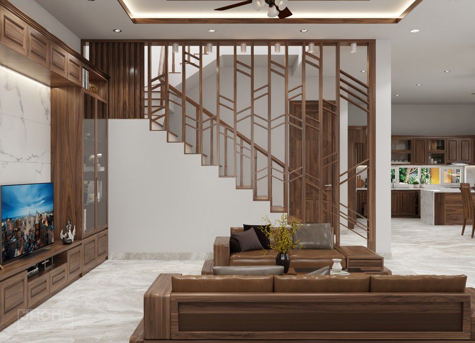 Phòng khách nhà mặt đất được thiết kế với tủ tivi kiêm tủ trang trí ấn tượng từ gỗ óc chóPhòng khách có bộ sofa gỗ óc chó được thiết kế ấn tượng, hiện đạiVách ngăn bằng gỗ veneer óc chó được thiết kế ấn tượng