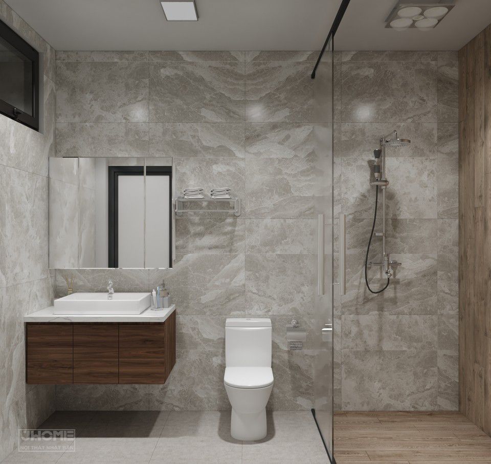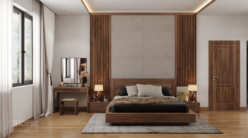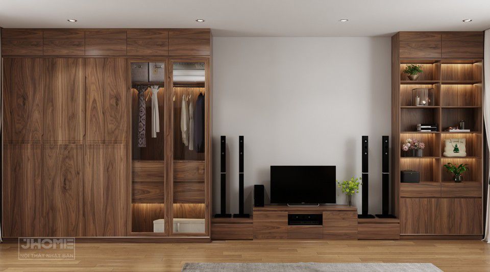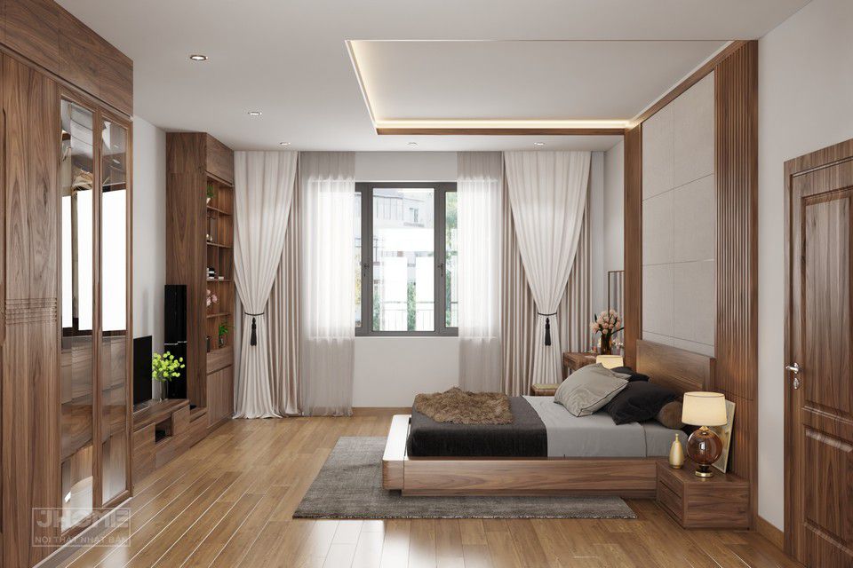 Thiết kế nội thất phòng ngủ master chất liệu gỗ óc chó kết hợp veneer óc chóKhông gian phòng ngủ sang trọngKệ tivi được thiết kế cạnh tủ quần áo với nhiều ngăn chứa đồ tiện lợiThiết kế nội thất phòng tắm hiện đại với vách tắm đứng