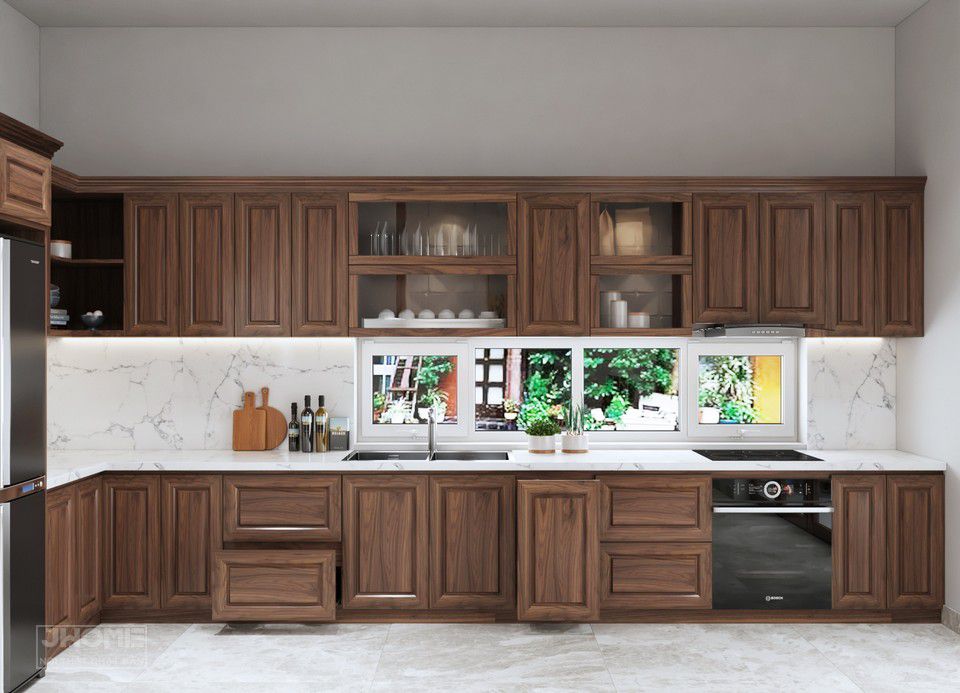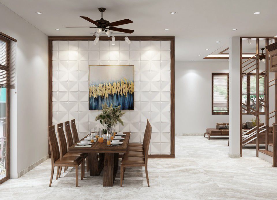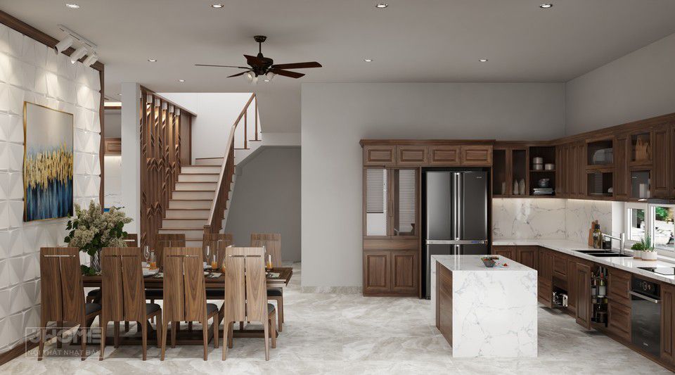 Thiết kế phòng bếp và phòng ăn cạnh nhau phong cách hiện đại, sang trọngTủ bếp chữ L được thiết kế có bàn đảo bằng gỗ óc chó sang trọngKhông gian phòng ăn được trang trí với tấm ốp tường 3D, trang bị bộ bàn ghế ăn gỗ óc chó cho 6 người