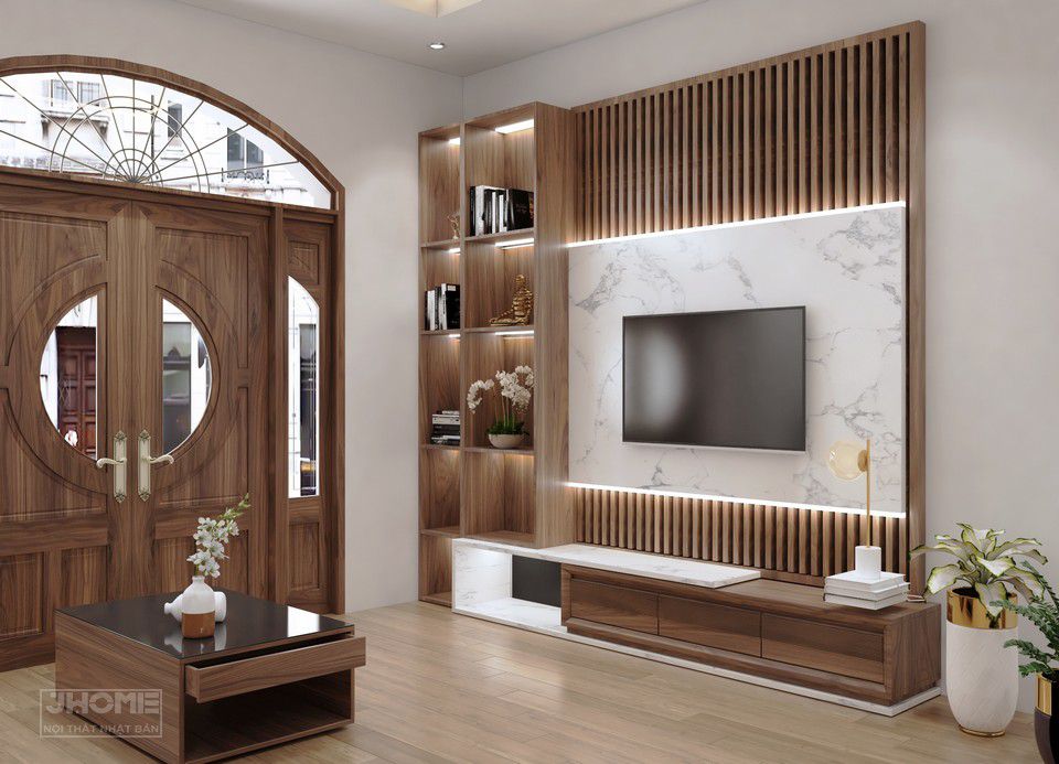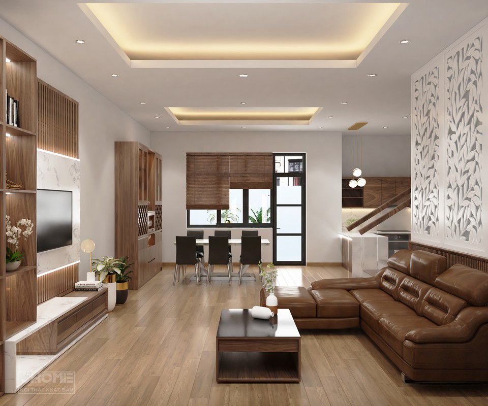 Thiết kế nội thất phòng khách hiện đại tông màu nâuBàn trà và kệ tivi được thiết kế hiện đại với chất liệu gỗ óc chó kết hợp gỗ công nghiệp