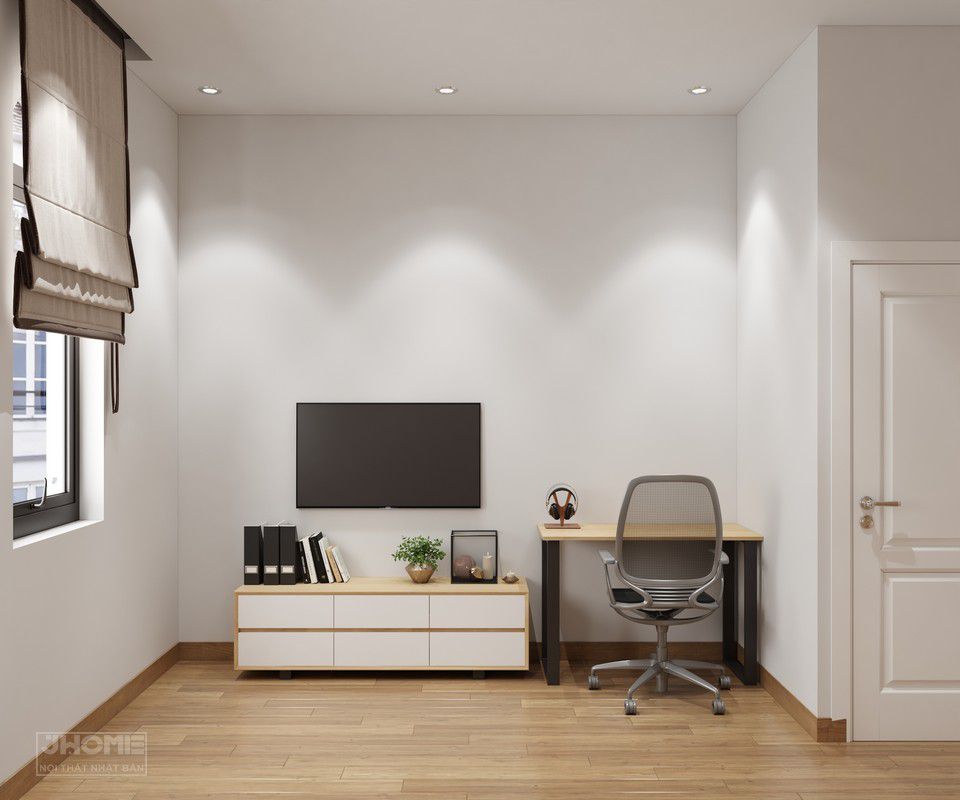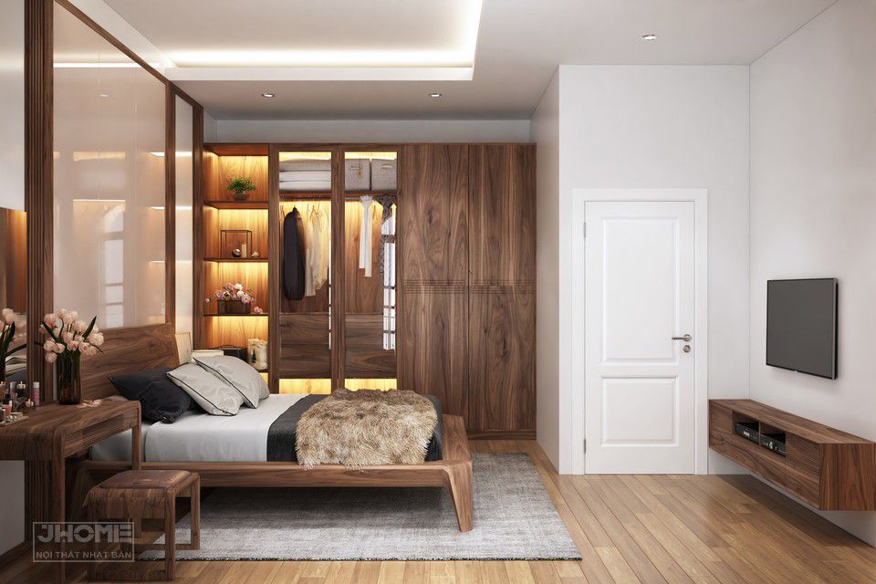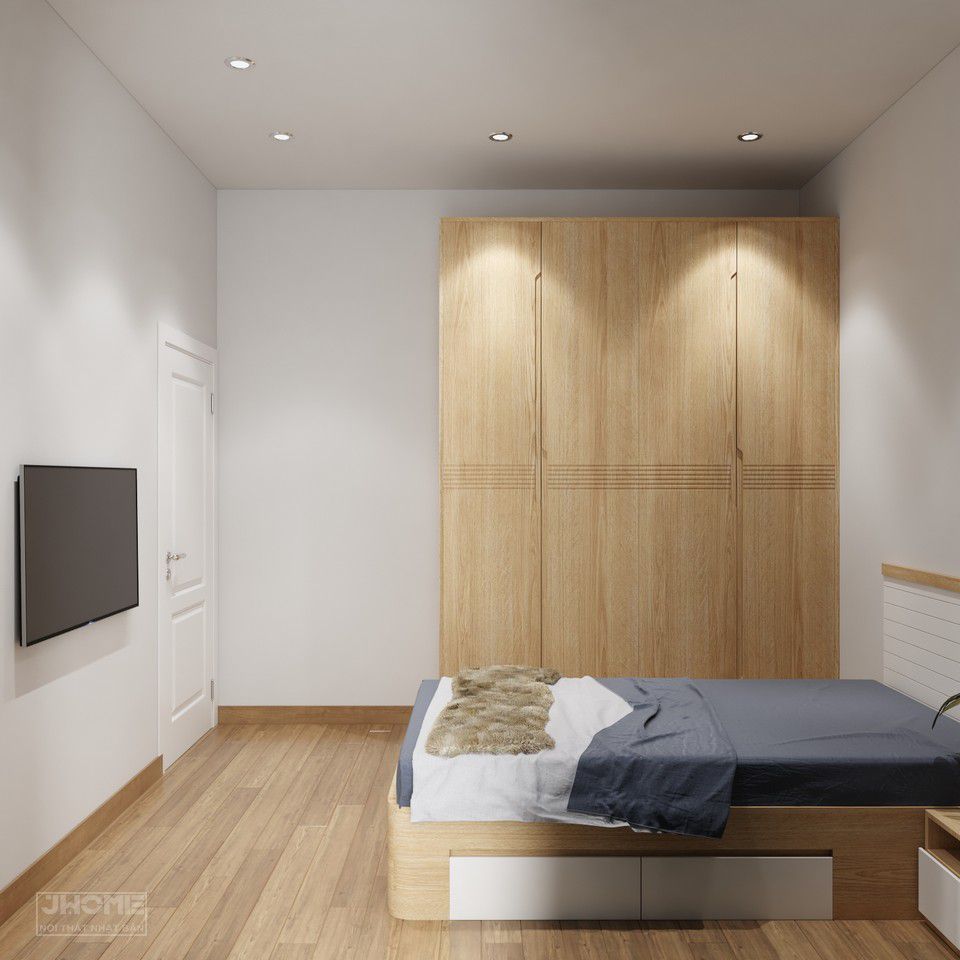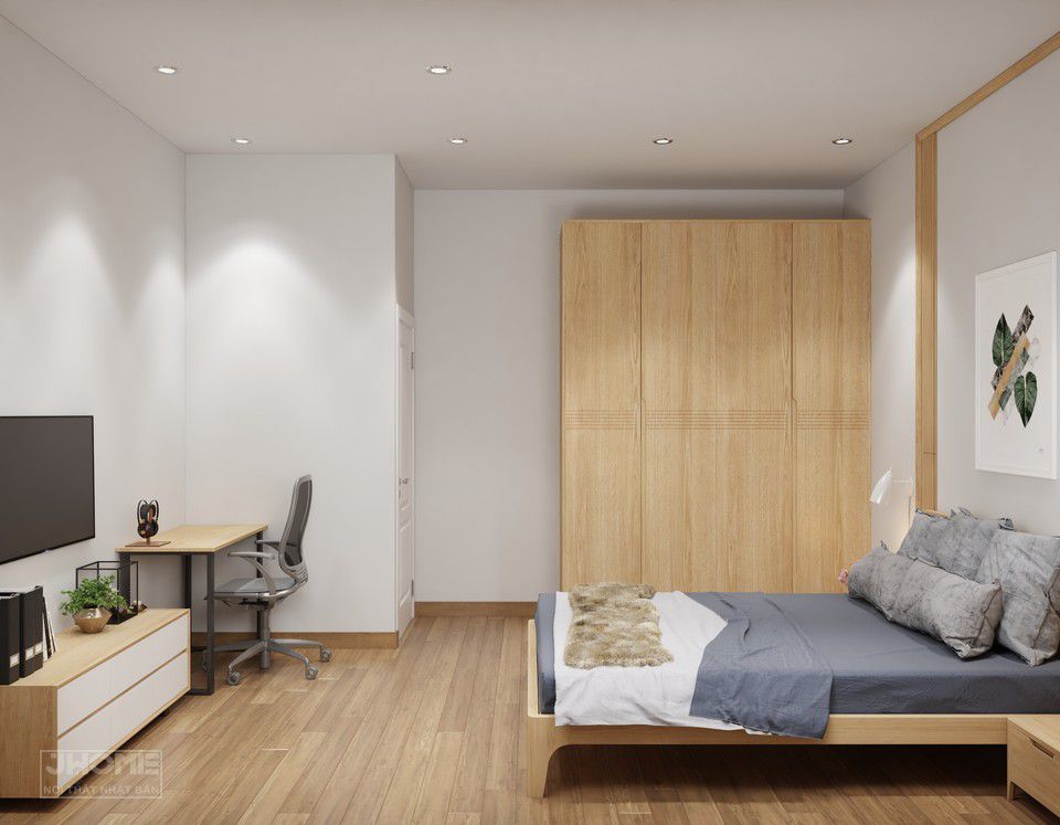Phòng ngủ ông bà với nội thất gỗ sồi tông màu sángTủ kệ tivi và bàn làm việc được thiết kế đơn giảnKhông gian hiện đại, đơn giản của phòng ngủ