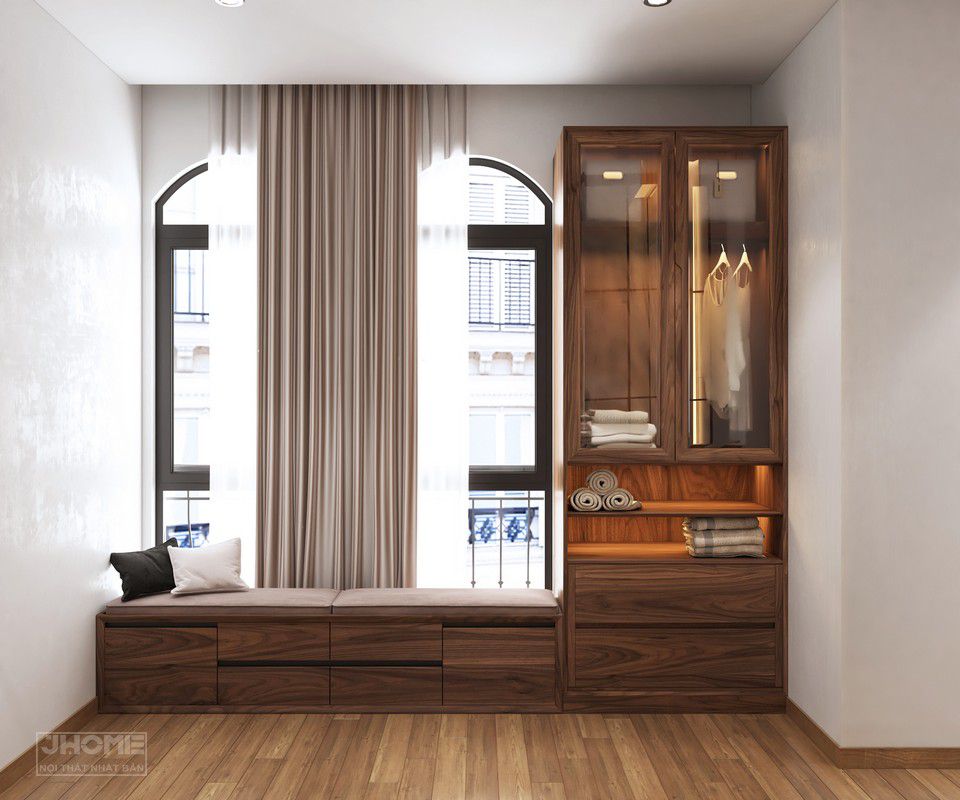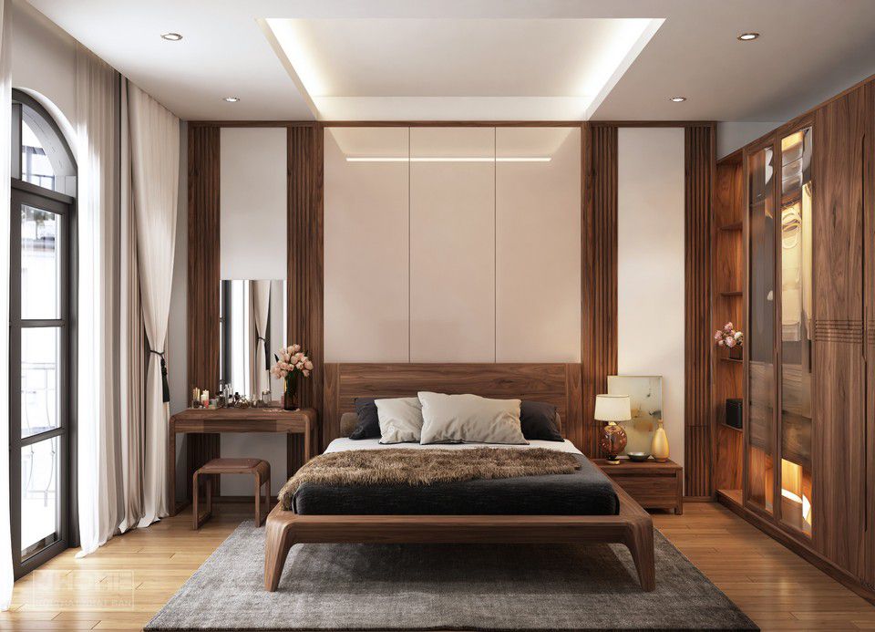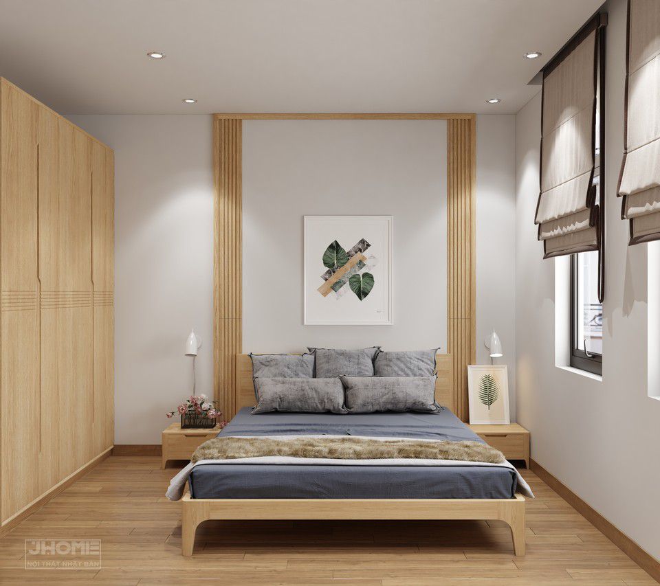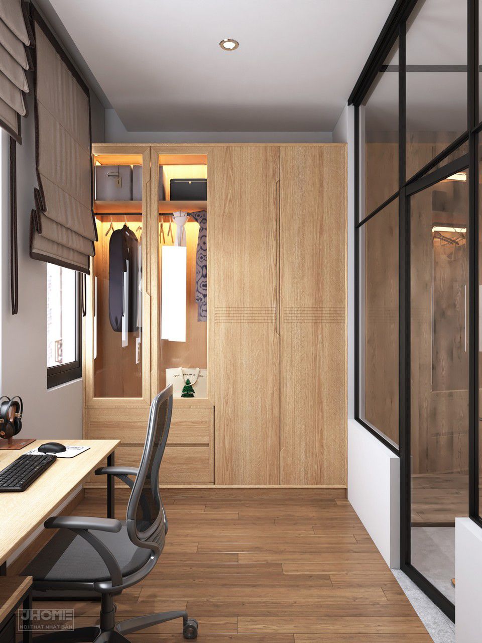 Phòng ngủ ông bà với nội thất gỗ sồi tông màu sángTủ kệ tivi và bàn làm việc được thiết kế đơn giảnKhông gian hiện đại, đơn giản của phòng ngủ