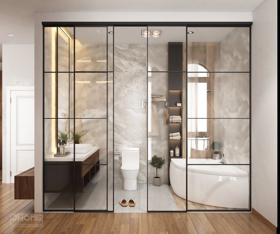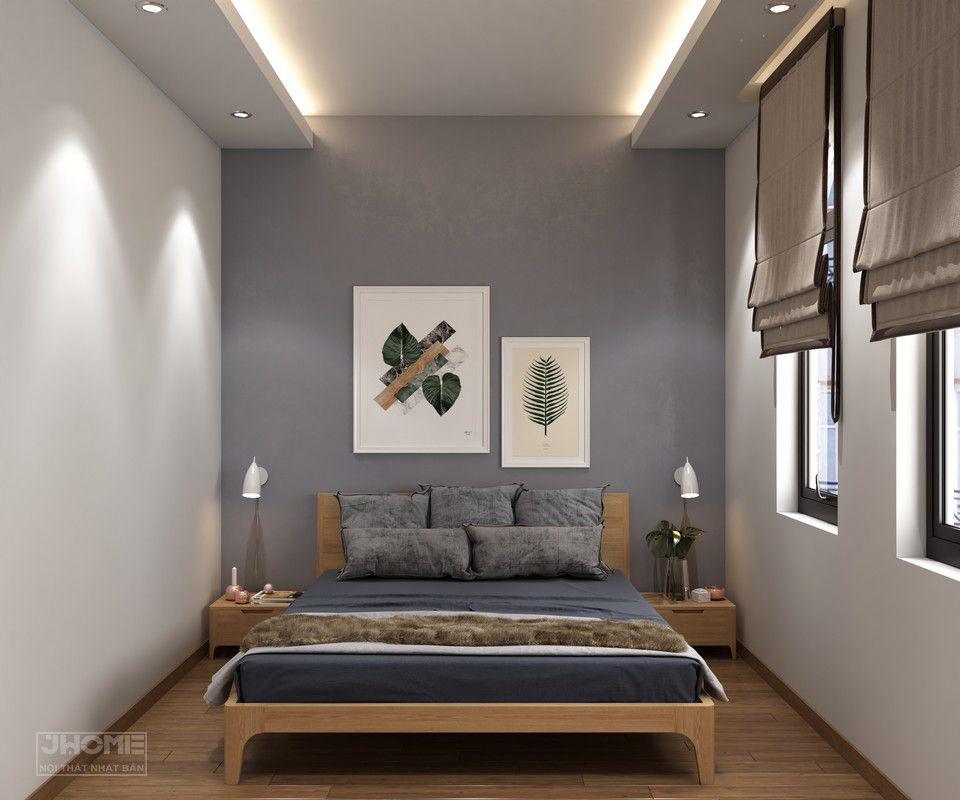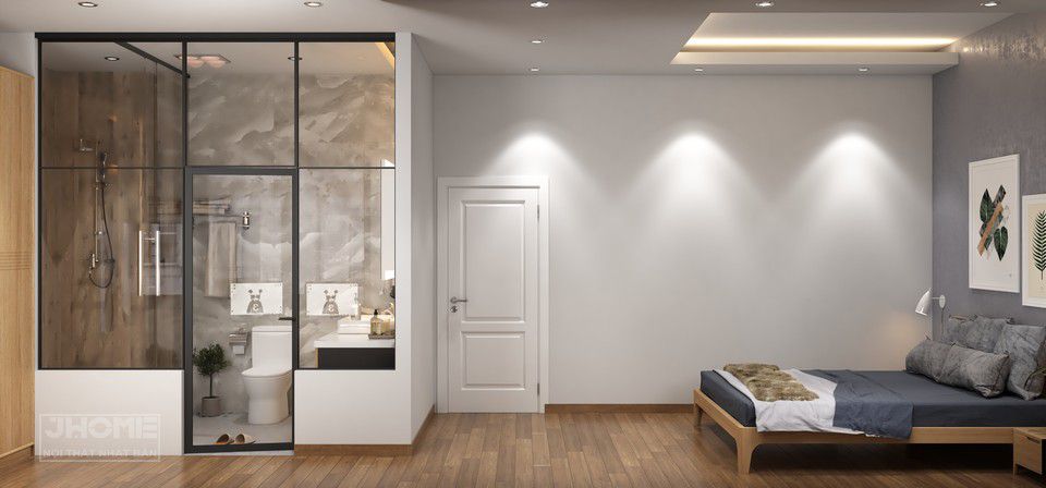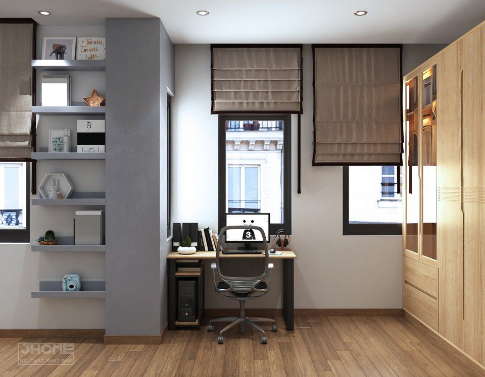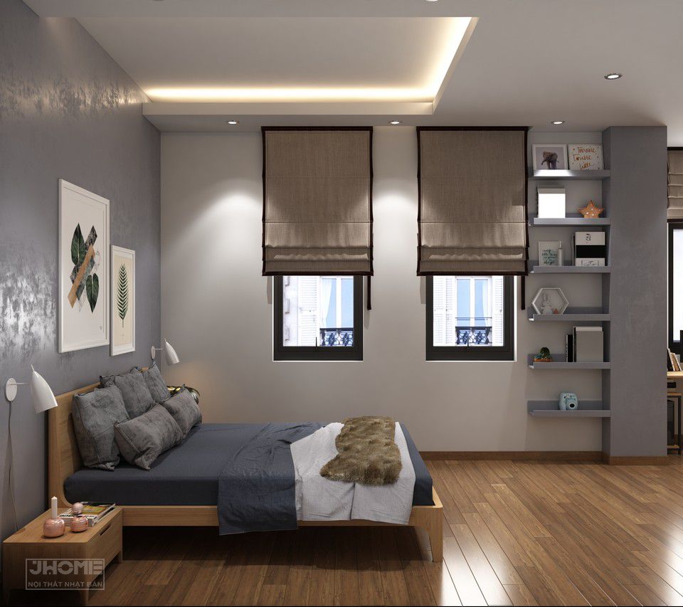 Phòng ngủ con tầng 2 có thiết kế với mảng tường sơn màu ghi xámGiường, 2 tab đầu giường được thiết kế với chất liệu gỗ sồi tự nhiênTrong phòng ngủ còn thiết kế 1 phòng tắm nhỏĐối diện phòng tắm là khu vực bàn học với giá sách độc đáoTủ quần áo gỗ sồi với thiết kế hiện đạiNội thất phòng tắm hiện đạiKhu vực tắm được ngăn cách bằng vách tắm kính