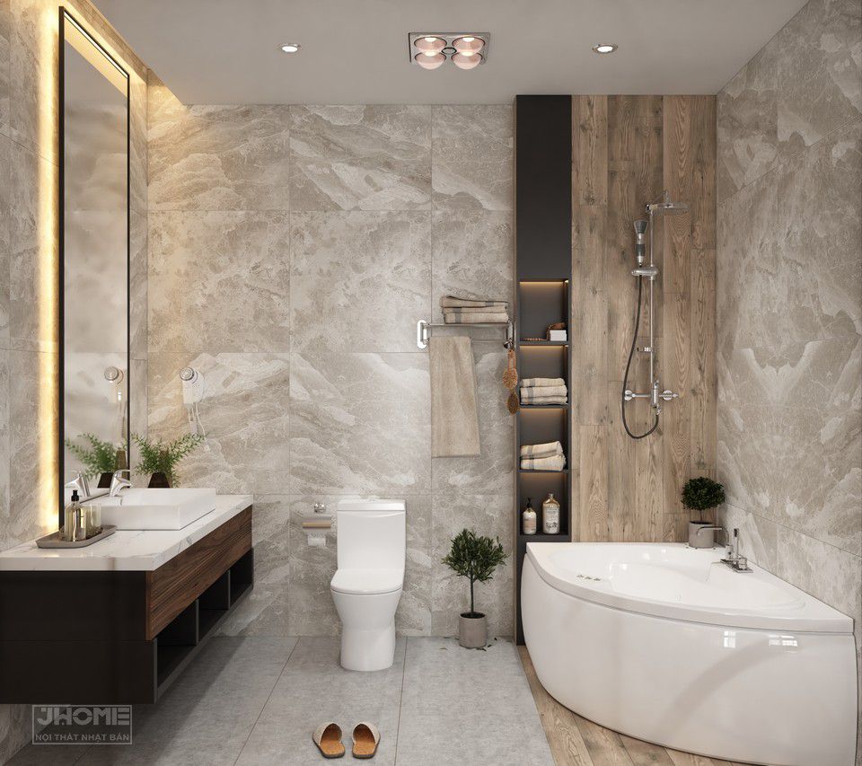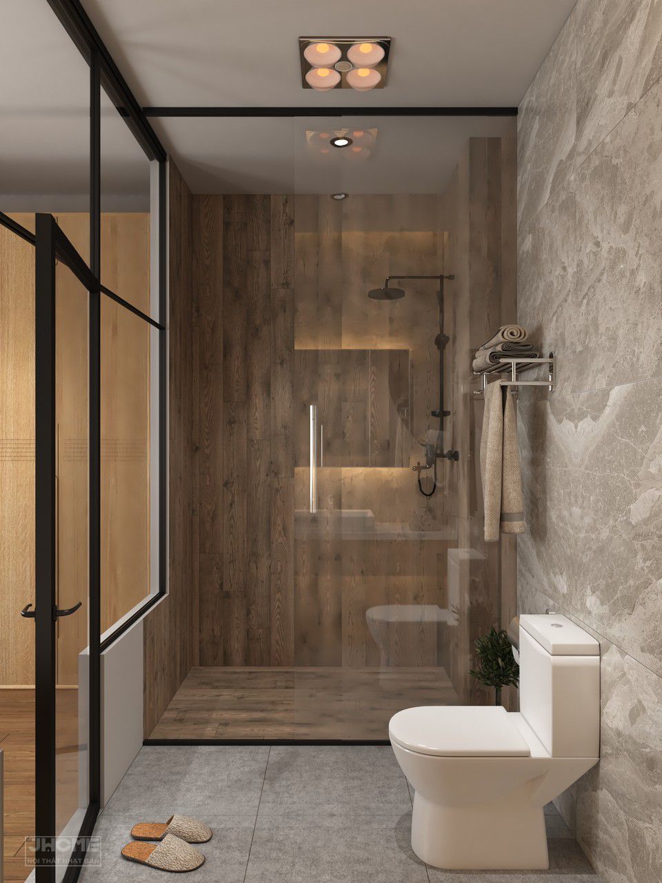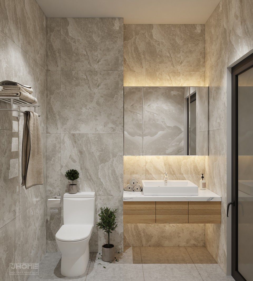 Phòng ngủ con tầng 2 có thiết kế với mảng tường sơn màu ghi xámGiường, 2 tab đầu giường được thiết kế với chất liệu gỗ sồi tự nhiênTrong phòng ngủ còn thiết kế 1 phòng tắm nhỏĐối diện phòng tắm là khu vực bàn học với giá sách độc đáoTủ quần áo gỗ sồi với thiết kế hiện đạiNội thất phòng tắm hiện đạiKhu vực tắm được ngăn cách bằng vách tắm kính