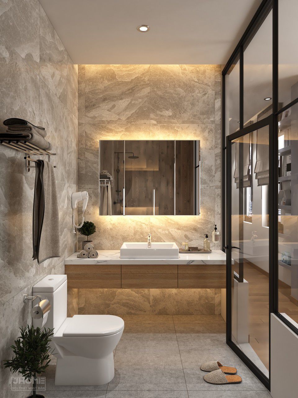 Phòng ngủ master của căn hộ có thiết kế hiện đại với chất liệu gỗ óc chóTủ quần áo có thiết kế hiện đại kết hợp mặt cánh tủ bằng gỗ và kínhNhững đường nét đồ nội thất được thiết kế mềm mại, sang trọngKhông gian nghỉ và thay đồ với hệ ghế nghỉ kèm tủ chứa đồPhòng tắm trong phòng ngủ master được ngăn cách bằng cánh cửa kính trongThiết kế nội thất phòng tắm hiện đại, sang trọng
