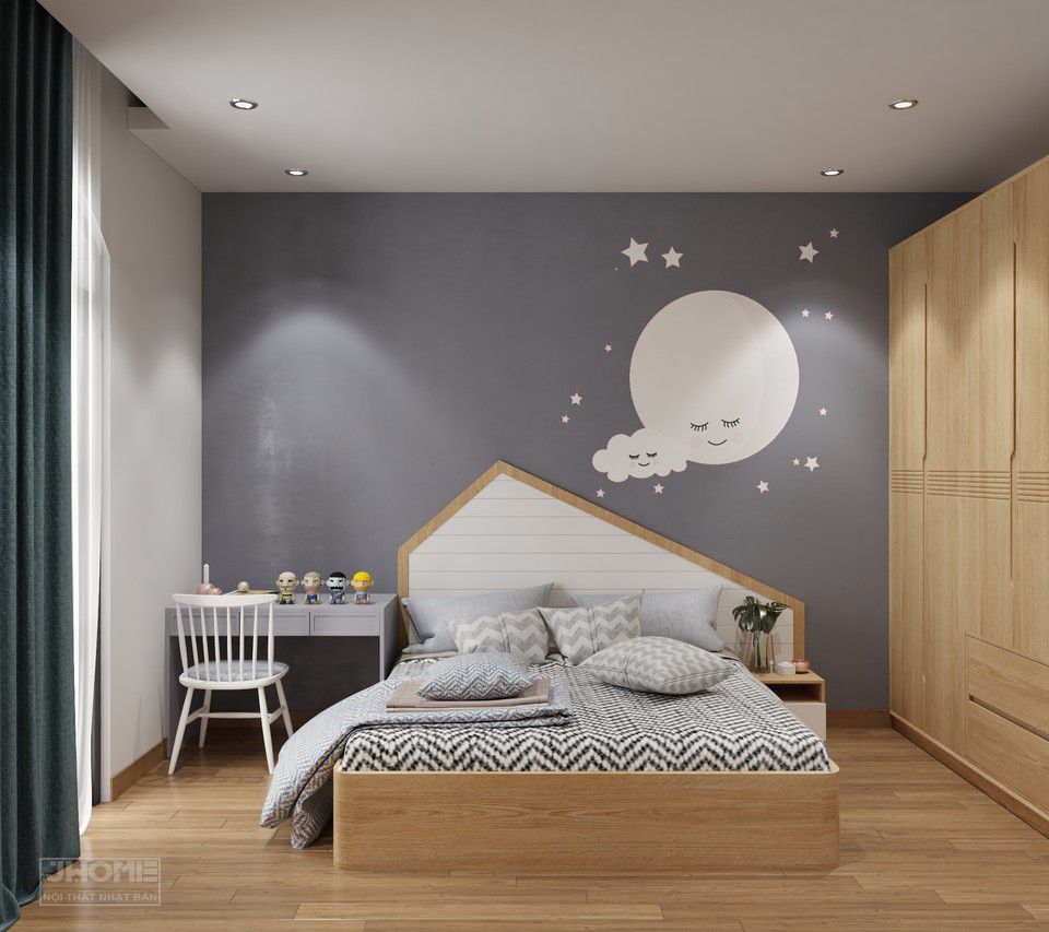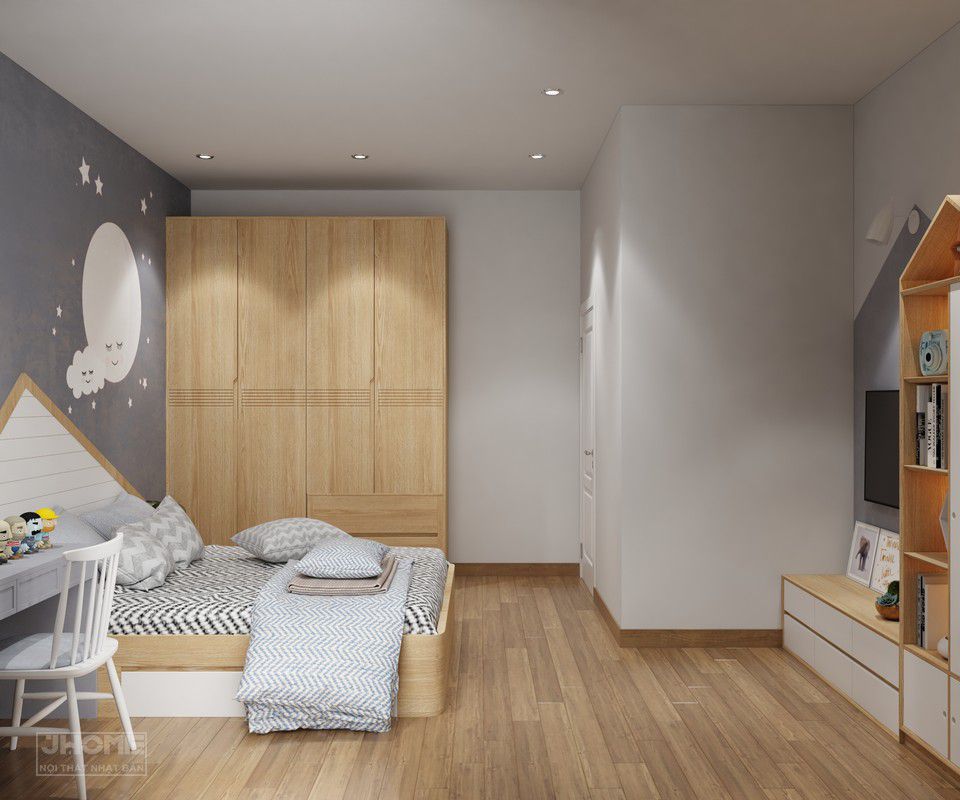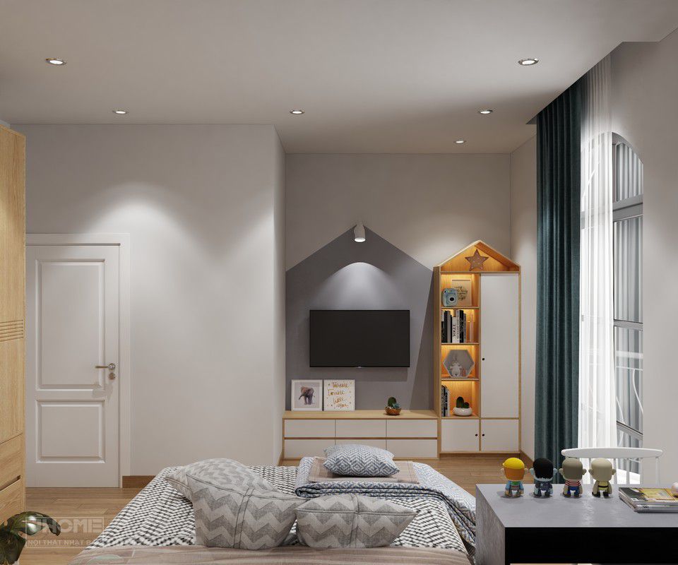 Phòng ngủ con 2 được thiết kế với mảng tường trang trí dễ thươngKệ tivi cạnh tủ trưng bày với mái mô phỏng hình mái nhà đẹp mắtTủ quần áo 4 cánh gỗ sồi