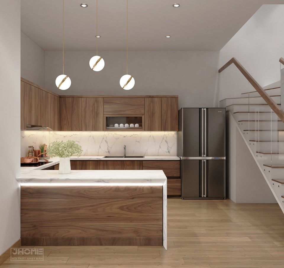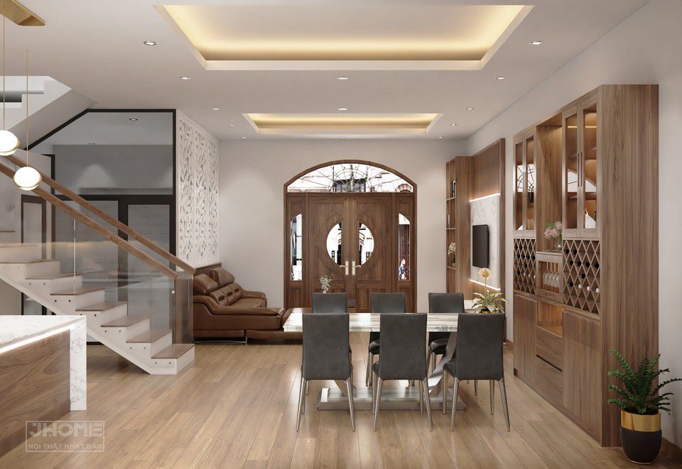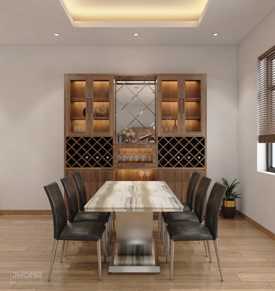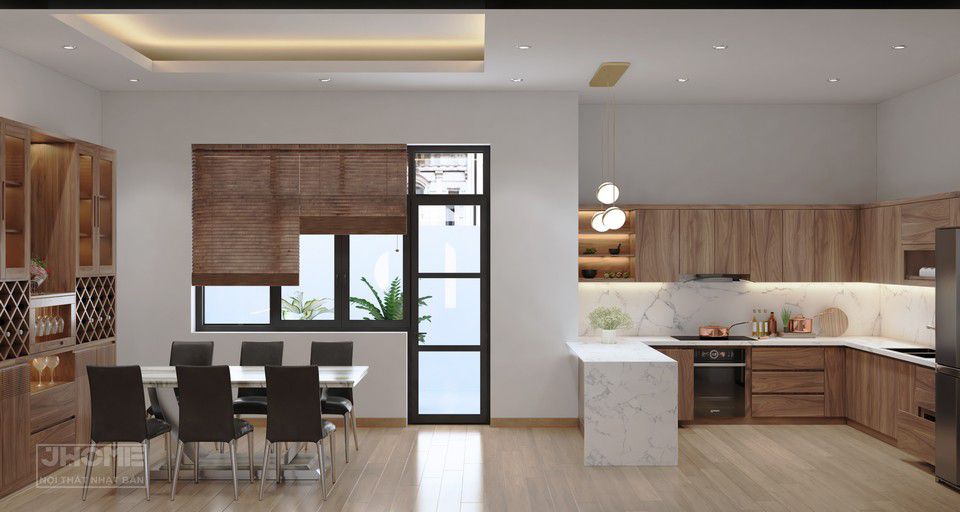 Thiết kế không gian phòng khách liền phòng ăn và bếpThiết kế phòng ăn và bếp rộng rãi, thông thoáng phong cách hiện đạiPhòng ăn có tủ rượu gỗ óc chó với thiết kế hiện đại, sang trọngTủ bếp chữ U chất liệu gỗ óc chó, mặt bếp bằng đá marble vân mây sáng màu hiện đại