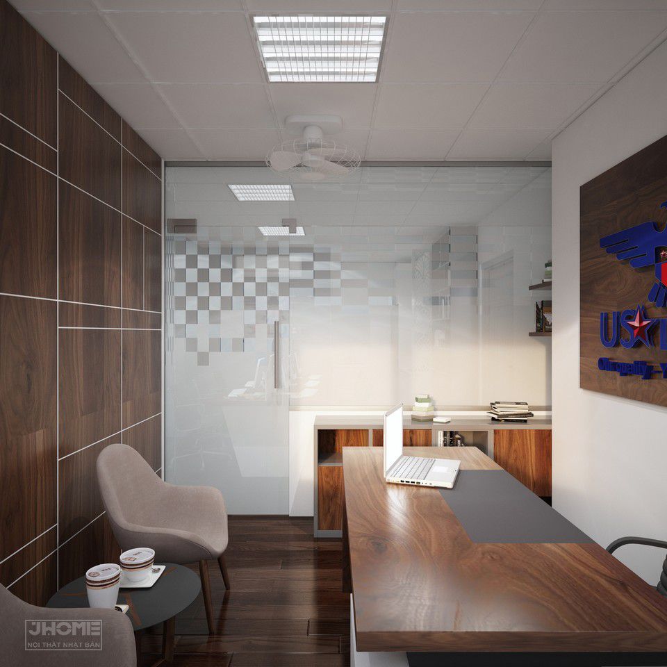 Phòng kế toán trang trí với hệ ốp gỗ sau lưng bằng gỗ óc chó tự nhiên