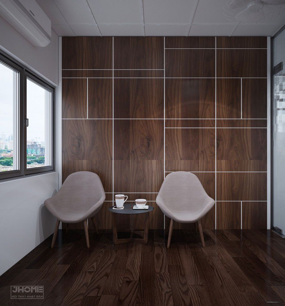 Khu vực tiếp khách có 2 chiếc ghế + 1 chiếc bàn, tường trang trí bằng các tấm veneer óc chó đẹp mắt