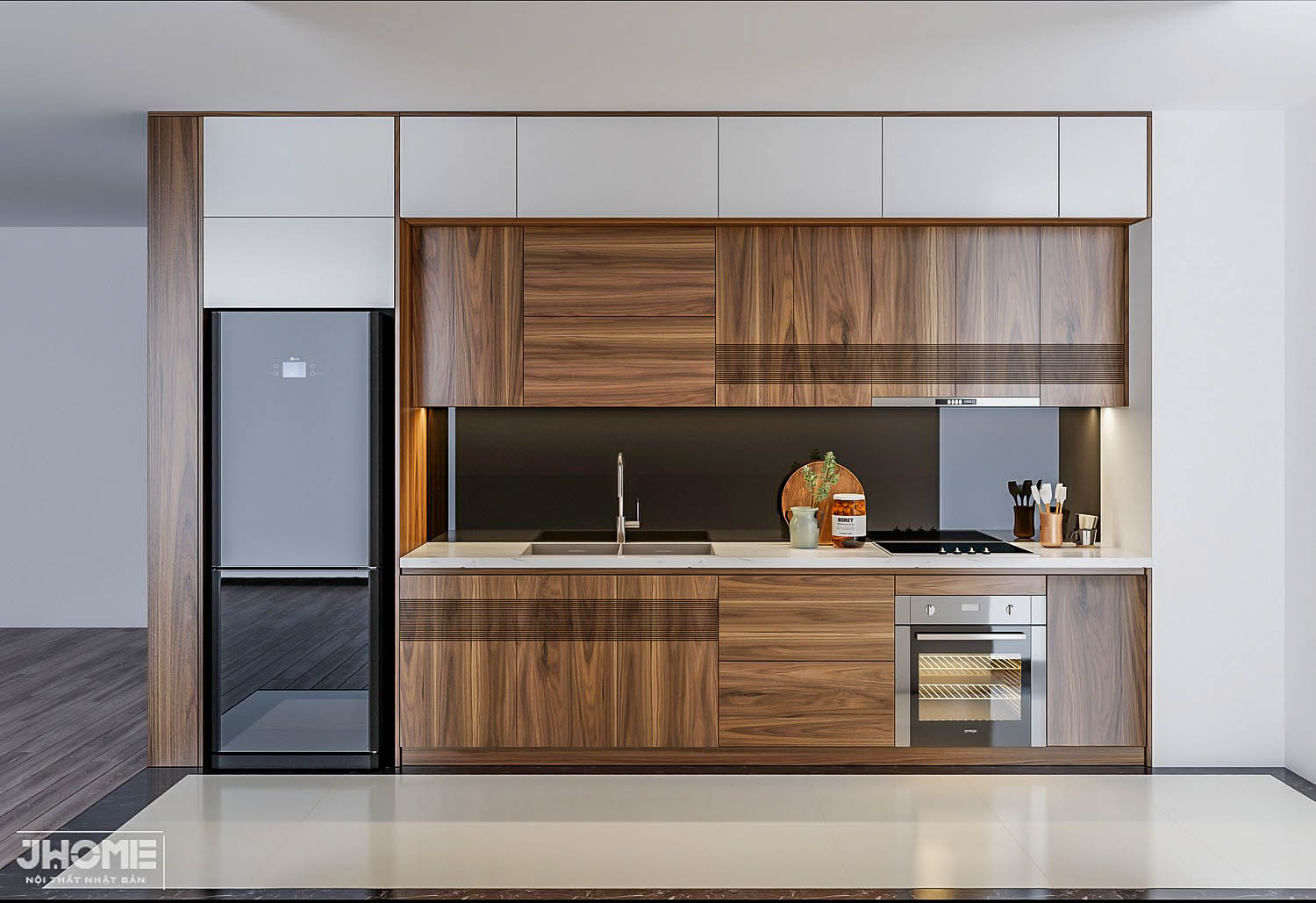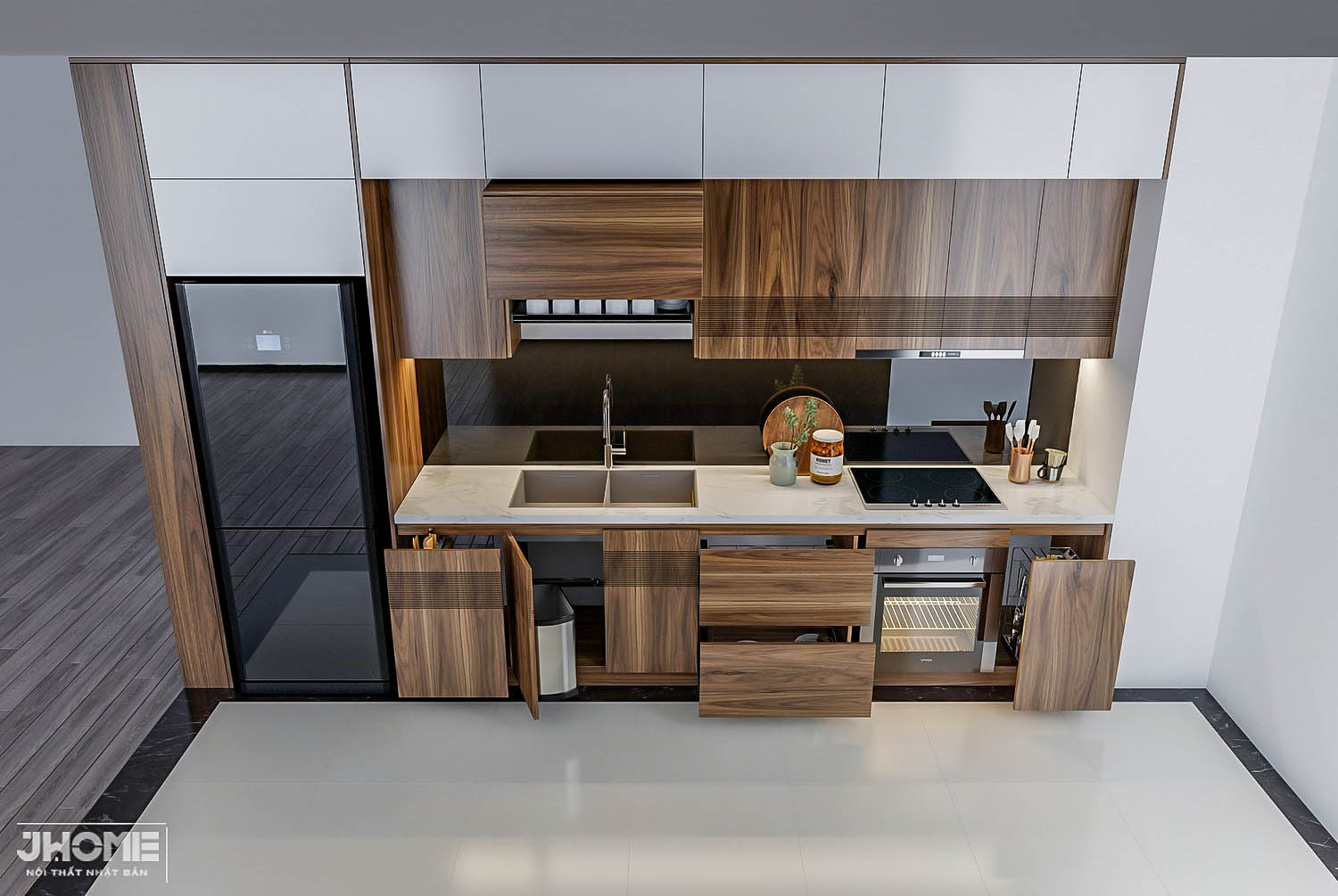 Tủ bếp được làm từ chất liệu gỗ óc chó tự nhiên với vân gỗ đẹp, đẳng cấp
