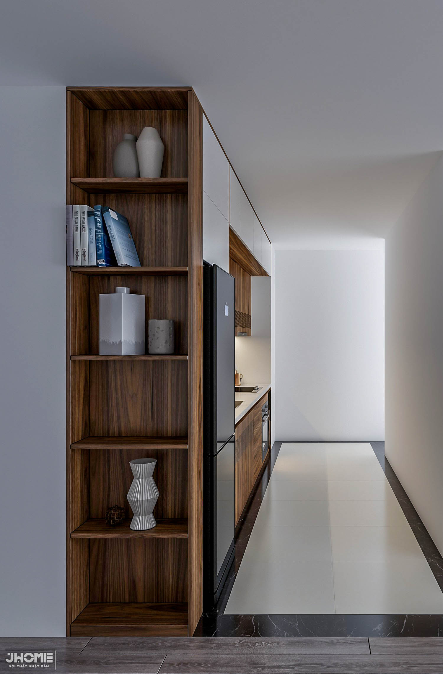 Cạnh tủ bếp là các đợt kệ để đồ trang trí, sách…