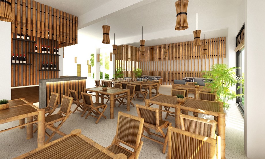 Thiết kế nhà hàng bằng tre nên sử dụng thêm nhiều vật dụng khác từ tre
